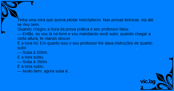 Tinha uma loira que queria pilotar helicópteros. Nas provas teóricas, ela até se deu bem.