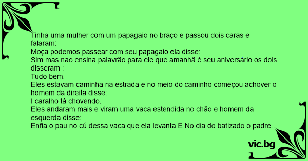 Enfia o раu no cú dessa vаса que ela levanta E No dia do batizado o padre começou a jogar água no papagaio ele :