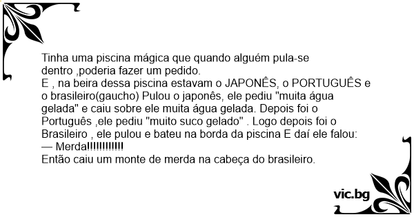 E , na beira dessa piscina estavam o JAPONÊS, o PORTUGUÊS e o brasileiro(gaucho) Pulou o japonês, ele pediu "muita água gelada" e caiu sobre ele muita água gelada. Depois foi o Português ,ele pediu "muito suco gelado" . Logo depois foi o Brasileiro , ele pulou e bateu na borda da piscina E daí ele falou: