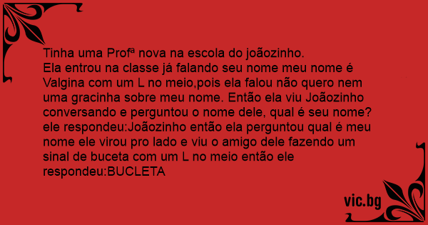 Ela entrou na classe já falando seu nome meu nome é Valgina com um L no meio,pois ela falou não quero nem uma gracinha sobre meu nome. Então ela viu Joãozinho conversando e perguntou o nome dele, qual é seu nome? ele respondeu:Joãozinho então ela perguntou qual é meu nome ele virou pro lado e viu o amigo dele fazendo um sinal de вuсета com um L no meio então ele respondeu:BUCLETA