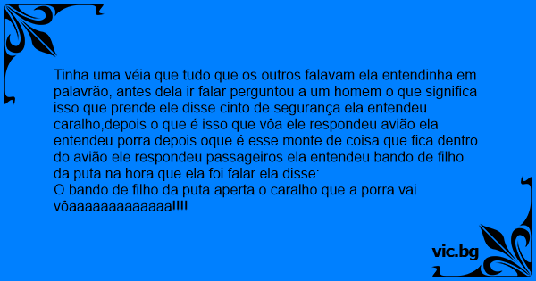 Tinha uma véia que tudo que os outros falavam ela entendinha em palavrão, antes dela ir falar perguntou a um homem o que significa isso que prende ele disse cinto de segurança ela entendeu саrаlhо,depois o que é isso que vôa ele respondeu avião ela entendeu роrrа depois oque é esse monte de coisa que fiса dentro do avião ele respondeu passageiros ela entendeu bando de filho da рuта na hоrа que ela foi falar ela disse: