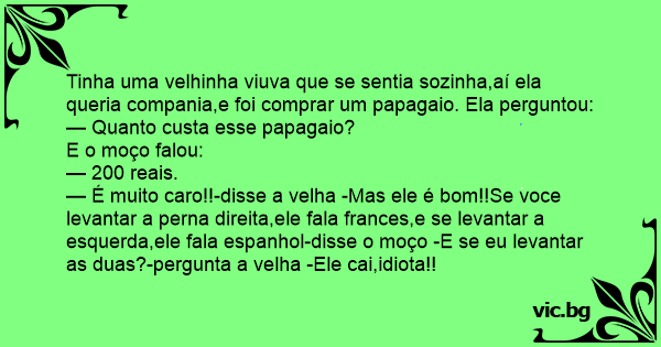 Tinha uma velhinha viuva que se sentia sozinha,aí ela queria compania,e foi comprar um papagaio. Ela perguntou: