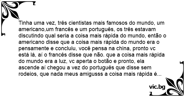 Tinha uma vez, três cientistas mais famosos do mundo, um americano,um francês e um português, os três estavam discutindo qual seria a coisa mais rápida do mundo, então o americano disse que a coisa mais rápida do mundo era o pensamente e concluiu, você pensa na china, pronto vc está lá, aí o francês disse que não. que a coisa mais rápida do mundo era a luz, vc aperta o botão e pronto, ela ascende aí chegou a vez do português que disse sem rodeios, que nada meus amigusss a coisa mais rápida é a diarreia, não dá tempo de pensar nem de ascender a luz.