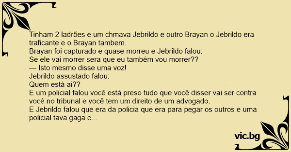 E Jebrildo falou que era da policia que era para pegar os outros e uma policial tava gaga e falou vo-vo-você es-esta pre-pre-preso va-vai ppa-pa-ra o-o ca-carro he-he-he-he-he-he-he!!!