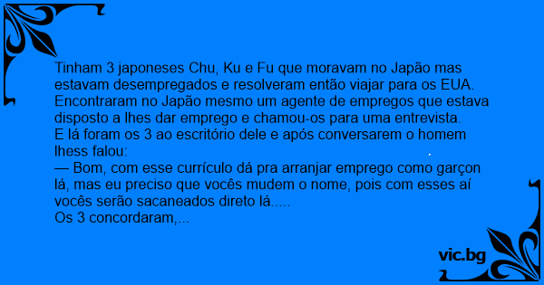 Tinham 3 japoneses Chu, Ku e Fu que moravam no Japão mas estavam desempregados e resolveram então viajar para os EUA.