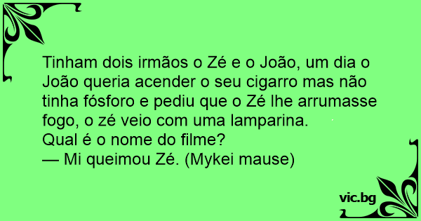 Tinham dois irmãos o Zé e o João, um dia o João queria acender o seu cigarro mas não tinha fósforo e pediu que o Zé lhe arrumasse fogo, o zé veio com uma lamparina.
