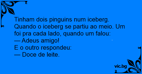 Tinham dois pinguins num iceberg. Quando o iceberg se partiu ao meio. Um foi pra cada lado, quando um falou: