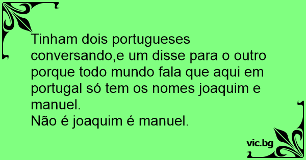 Tinham dois portugueses conversando,e um disse para o outro porque todo mundo fala que aqui em portugal só tem os nomes joaquim e manuel.