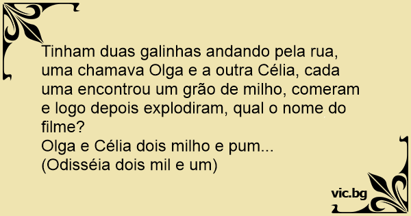 Tinham duas galinhas andando pela rua, uma chamava Olga e a outra Célia, cada uma encontrou um grão de milho, comeram e logo depois explodiram, qual o nome do filme?