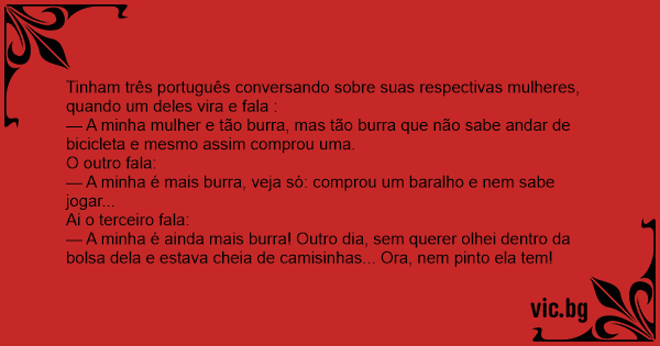 Tinham três português conversando sobre suas respectivas mulheres, quando um deles vira e fala :