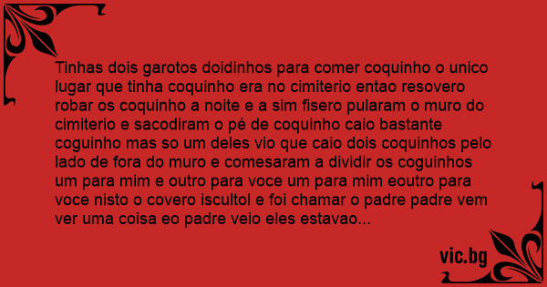 Tinhas dois garotos doidinhos para comer coquinho o unico lugar que tinha coquinho era no cimiterio entao resovero robar os coquinho a noite e a sim fisero pularam o muro do cimiterio e sacodiram o pé de coquinho caio bastante coguinho mas so um deles vio que caio dois coquinhos pelo lado de fora do muro e comesaram a dividir os coguinhos um para mim e outro para voce um para mim eoutro para voce nisto o covero iscultol e foi chamar o padre padre vem ver uma coisa eo padre veio eles estavao um paramim e outro para voce Deus eo diabo estao separando as almas esta ai acabou nao ainda faltam dois aonde estao la dolado de fora eos dois sairam corendo.