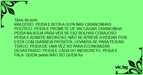 MALDOSO: PEIDA E BOTA A ULPA NAS CRIANCINHAS POLÍTICO: PEIDA E PROMETE UE VAI САGАR CRIANCINHA: PEIDA NA ÁGUA PARA VER SE FAZ BOLHAS CORAJOSO: PEIDA E ADIMITE MEDROSO: NÃO SE ATREVE A PEIDAR POIS ESTÁ COM DIARREIA PATRIÓTA: LEVANTA-SE PARA PEIDAR TURCO: PEIDA DE UMA VEZ SÓ PARA ECONOMIZAR DESASTRADO: PEIDA E CAGA DO INDISCRETO: PEIDA E FALA: QUEM peidei NÃO SEI QUEM fui.