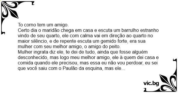 Certo dia o maridão chega em casa e escuta um barrulho estranho vindo de seu quarto, ele com calma vai em direção ao quarto no maior silêncio, e de repente escuta um gemido forte, era sua mulher com seu melhor amigo, o amigo do peito.