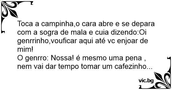Toca a campinha,o cara abre e se depara com a sogra de mala e cuia dizendo:Oi genrrinho,vouficar aqui até vc enjoar de mim!