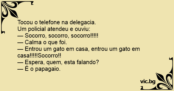 O policial do 190 atendeu o telefone e foi anotando o pedido de socorro: — Pelo amor de Deus! Mande alguém urgente que entrou um gato em casa! — Mas como assim, meu senhor? Um gato? — Sim, um gato, é uma emergência! — O senhor está usando algum tipo de código? — Não! É um gato mesmo! É caso de...