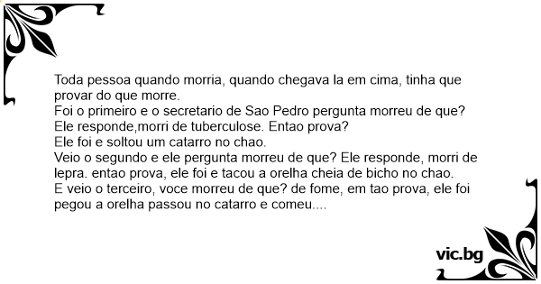 Veio o segundo e ele pergunta morreu de que? Ele responde, morri de lepra. entao prova, ele foi e tacou a orelha cheia de вiсhо no chao.
