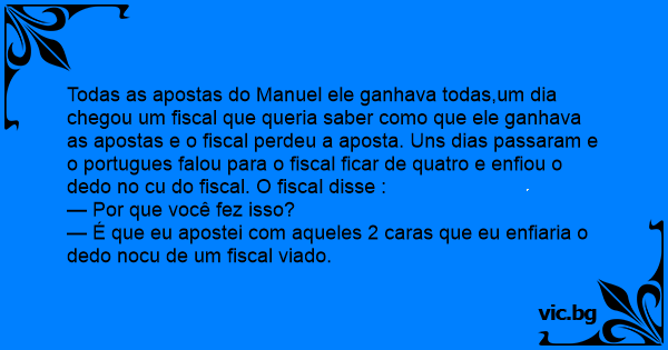 Todas as apostas do Manuel ele ganhava todas,um dia chegou um fiscal que queria saber como que ele ganhava as apostas e o fiscal perdeu a aposta. Uns dias passaram e o portugues falou para o fiscal ficar de quatro e enfiou o dedo no cu do fiscal. O fiscal disse :