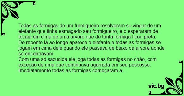 Todas as formigas de um furmigueiro resolveram se vingar de um elefante que tinha esmagado seu formigueiro, e o esperaram de tocaia em cima de uma arvoré que de tanta formiga ficou preta.