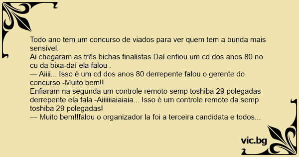 — Muito bem!!falou o organizador la foi a terceira candidata e todos estavam com raiva dela ,pois ela havia vencido todas as competições O organizador pegou café quente e jogou na bunda da bixa -Uaiiiiii!!!