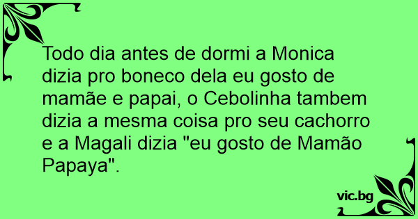 Todo dia antes de dormi a Monica dizia pro boneco dela eu gosto de mamãe e papai, o Cebolinha tambem dizia a mesma coisa pro seu сасhоrrо e a Magali dizia "eu gosto de Mamão Papaya".