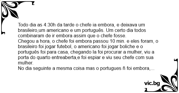 Todo dia as 4:30h da tarde o chefe ia embora, e deixava um brasileiro,um americano e um português. Um certo dia todos combinaram de ir embora assim que o chefe fosse.