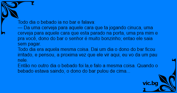 Então no outro dia o bebado foi la,e falo a mesma coisa. Quando o bebado estava saindo, o dono do bar pulou de cima do balcão, e deu um coro no bebado.
