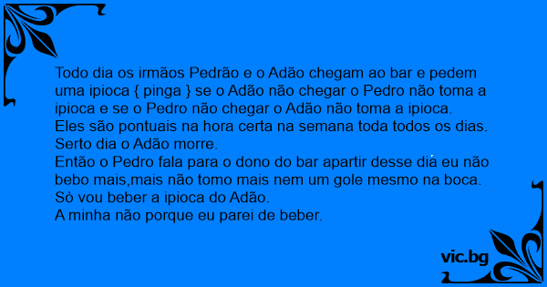 Todo dia os irmãos Pedrão e o Adão chegam ao bar e pedem uma ipioca { pinga } se o Adão não chegar o Pedro não toma a ipioca e se o Pedro não chegar o Adão não toma a ipioca.