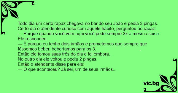 Todo dia um certo rapaz chegava no bar do seu João e pedia 3 pingas.