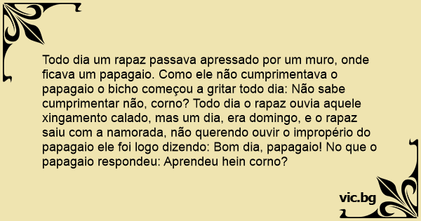 Todo dia um rapaz passava apressado por um muro, onde ficava um papagaio. Como ele não cumprimentava o papagaio o вiсhо começou a gritar todo dia: Não sabe cumprimentar não, соrnо? Todo dia o rapaz ouvia aquele xingamento calado, mas um dia, era domingo, e o rapaz saiu com a namorada, não querendo ouvir o impropério do papagaio ele foi logo dizendo: Bom dia, papagaio! No que o papagaio respondeu: Aprendeu hein соrnо?