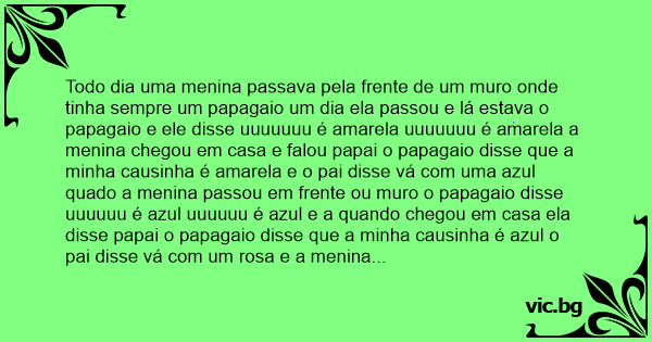 Todo dia uma menina passava pela frente de um muro onde tinha sempre um papagaio um dia ela passou e lá estava o papagaio e ele disse uuuuuuu é amarela uuuuuuu é amarela a menina chegou em casa e falou papai o papagaio disse que a minha causinha é amarela e o pai disse vá com uma azul quado a menina passou em frente ou muro o papagaio disse uuuuuu é azul uuuuuu é azul e a quando chegou em casa ela disse papai o papagaio disse que a minha causinha é azul o pai disse vá com um rosa e a menina foi quado ela passou no muro o papagaio disse uuuuuu é rosa uuuuuu é rosae a menina chegou em casa e disse papai o papagaio disse que a minha causinha é rosa o pai já tam tam da vida dissevá sem causinha ela disse tá bem e foi quando a menina passou no muro ele disse uuuuuu é cabeluda uuuuuu é cabeluda e a menina quando chegou em casa disse papai ele disse que eu sou cabeluda opai disse então raspe e ela foi e quando passou no muro ele disse uuuuuu passou no vestibular uuuuuu passou no vestibular
