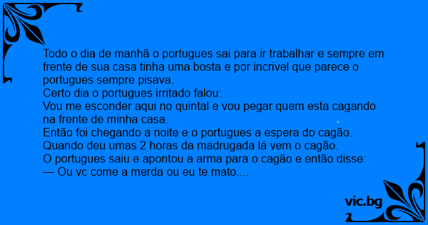 Todo o dia de manhã o portugues sai para ir trabalhar e sempre em frente de sua casa tinha uma bosta e por incrivel que parece o portugues sempre pisava.