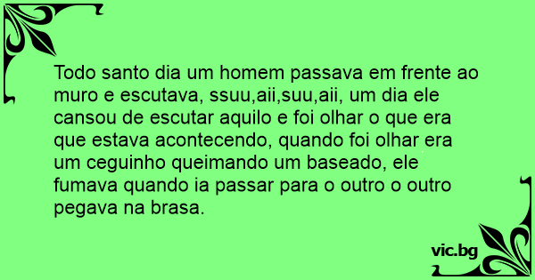Todo santo dia um homem passava em frente ao muro e escutava, ssuu,aii,suu,aii, um dia ele cansou de escutar aquilo e foi olhar o que era que estava acontecendo, quando foi olhar era um ceguinho queimando um baseado, ele fumava quando ia passar para o outro o outro pegava na brasa.