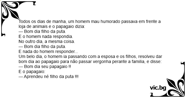Todos os dias de manha, um homem mau humorado passava em frente a loja de animais e o papagaio dizia: