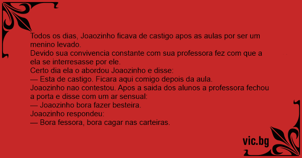 Joaozinho nao contestou. Apos a saida dos alunos a professora fechou a porta e disse com um ar sensual: