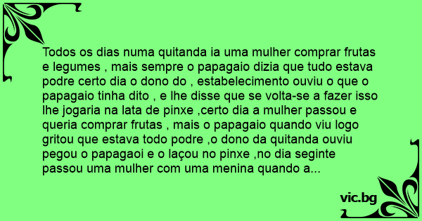 Todos os dias numa quitanda ia uma mulher comprar frutas e legumes , mais sempre o papagaio dizia que tudo estava podre certo dia o dono do , estabelecimento ouviu o que o papagaio tinha dito , e lhe disse que se volta-se a fazer isso lhe jogaria na lata de pinxe ,certo dia a mulher passou e queria comprar frutas , mais o papagaio quando viu logo gritou que estava todo podre ,o dono da quitanda ouviu pegou o papagaoi e o laçou no pinxe ,no dia seginte passou uma mulher com uma menina quando a menina viu o papagaio gritou, mãe olha o urubu , o papagaio respondeu que urubu o que eu sou é mecanico sua bobona.......