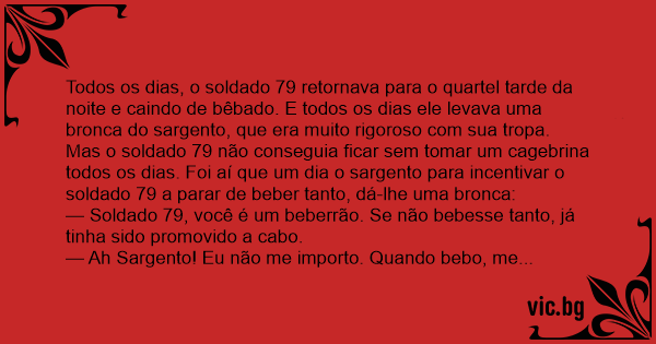 Todos os dias, o soldado 79 retornava para o quartel tarde da noite e caindo de bêbado. E todos os dias ele levava uma bronca do sargento, que era muito rigoroso com sua tropa. Mas o soldado 79 não conseguia ficar sem tomar um cagebrina todos os dias. Foi aí que um dia o sargento para incentivar o soldado 79 a parar de beber tanto, dá-lhe uma bronca: