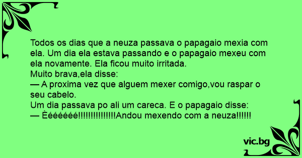 Todos os dias que a neuza passava o papagaio mexia com ela. Um dia ela estava passando e o papagaio mexeu com ela novamente. Ela ficou muito irritada.