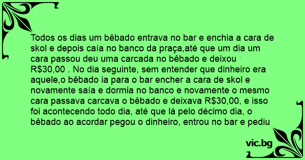 Todos os dias um bêbado entrava no bar e enchia a cara de skol e depois caía no banco da praça,até que um dia um cara passou deu uma carcada no bêbado e deixou R$30,00 . No dia seguinte, sem entender que dinheiro era aquele,o bêbado ia para o bar encher a cara de skol e novamente saía e dormia no banco e novamente o mesmo cara passava carcava o bêbado e deixava R$30,00, e isso foi acontecendo todo dia, até que lá pelo décimo dia, o bêbado ao acordar pegou o dinheiro, entrou no bar e pediu uma Antártica, sem entender, o dono do bar perguntou porquê ele não tomava mais skol, e imediatamente o bêbado respondeu que a skol estava dando ardencia no cú.