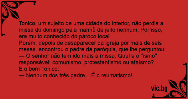 — O senhor não tem ido mais à missa. Qual é o "ïsmo" responsável: comunismo, protestantismo ou ateísmo?