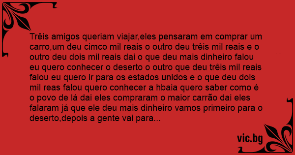 Trêis amigos queriam viajar,eles pensaram em comprar um carro,um deu cimco mil reais o outro deu trêis mil reais e o outro deu dois mil reais dai o que deu mais dinheiro falou eu quero conhecer o deserto o outro que deu trêis mil reais falou eu quero ir para os estados unidos e o que deu dois mil reas falou quero conhecer a hbaia quero saber como é o povo de lá dai eles compraram o maior carrão dai eles falaram já que ele deu mais dinheiro vamos primeiro para o deserto,depois a gente vai para os outros lugares dai eles foram para o deserto. No meio do deserto o carro para e não tem conserto de jeito nenhum emtão um falou vou pegar o ra diador se eu estiver com sede eu bebo a aguá,dai o outro fala vou pegar a ventuinha se tiver calor eu ligo na bateria derepente o outro fala vou pegar a porta então os outros falam mais porque você vai pegar a porta a se tiver muito calor eu abaixo o vidro.