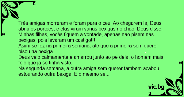 Três amigas morreram e foram para o ceu. Ao chegarem la, Deus abriu os portoes, e elas viram varias bexigas no chao. Deus disse: