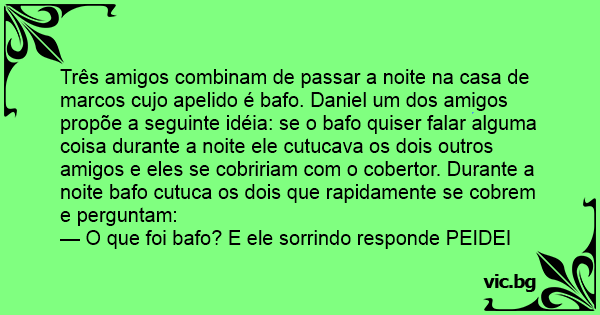 Três amigos combinam de passar a noite na casa de marcos cujo apelido é bafo. Daniel um dos amigos propõe a seguinte idéia: se o bafo quiser falar alguma coisa durante a noite ele cutucava os dois outros amigos e eles se cobririam com o cobertor. Durante a noite bafo cutuca os dois que rapidamente se cobrem e perguntam: