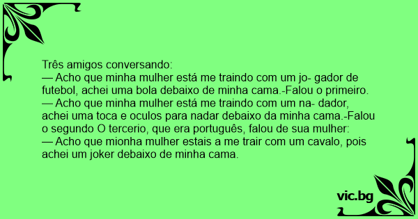 — Acho que minha mulher está me traindo com um na- dador, achei uma toca e oculos para nadar debaixo da minha cama.-Falou o segundo O tercerio, que era português, falou de sua mulher: