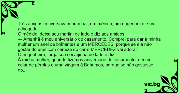 — Amanhã é meu aniversário de casamento. Comprei para dar à minha mulher um anel de brilhantes e um MERCEDES, porque se ela não gostar do anel com certeza do carro MERCEDEZ vai adorar.