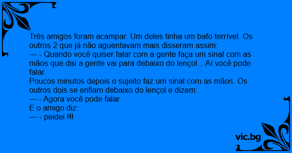 Três amigos foram acampar. Um deles tinha um bafo terrível. Os outros 2 que já não aguentavam mais disseram assim: