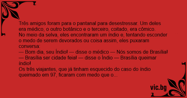 Três amigos foram para o pantanal para desestressar. Um deles era médico, o outro botânico e o terceiro, coitado, era cômico.