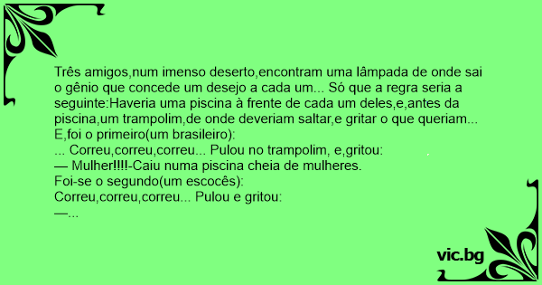 Três amigos,num imenso deserto,encontram uma lâmpada de onde sai o gênio que concede um desejo a cada um... Só que a regra seria a seguinte:Haveria uma piscina à frente de cada um deles,e,antes da piscina,um trampolim,de onde deveriam saltar,e gritar o que queriam...