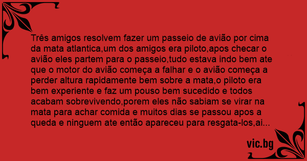 Três amigos resolvem fazer um passeio de avião por cima da mata atlantica,um dos amigos era piloto,apos checar o avião eles partem para o passeio,tudo estava indo bem ate que o motor do avião começa a falhar e o avião começa a perder altura rapidamente bem sobre a mata,o piloto era bem experiente e faz um pouso bem sucedido e todos acabam sobrevivendo,porem eles não sabiam se virar na mata para achar comida e muitos dias se passou apos a queda e ninguem ate então apareceu para resgata-los,ai um dos amigos teve a ideia de cortar uma parte do corpo para comerem,ele corta uma parte do braço,outro tambem seguiu essa ideia pois a fome era tanta que não restou outra alternativa,ele corta uma parte da perna,o terceiro amigo que era o piloto abriu o ziper da calça e colocou o реnis pra fora,um dos amigos falou: