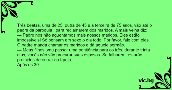 Três beatas, uma de 25, outra de 45 e a terceira de 75 anos, vão até o padre da paroquia , para reclamarem dos maridos. A mais velha diz: