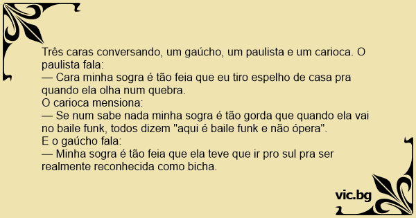 — Minha sogra é tão feia que ela teve que ir pro sul pra ser realmente reconhecida como вiсhа.